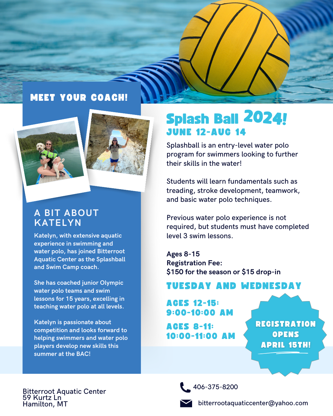 We are thrilled to announce that Katelyn has joined the Bitterroot Aquatic Center as our Splashball and Swim Camp coach!